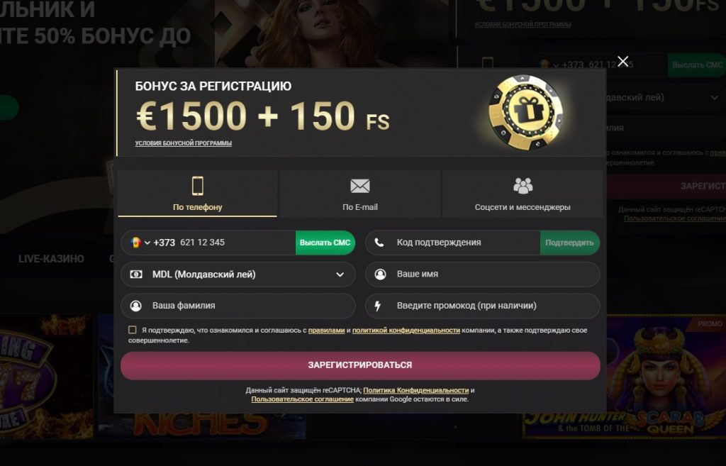 Второе способ – по номеру телефона. Необходимо указать номер, выбрать валюту для игры, фамилию и имя. Если есть промокод, вводят в соответствующем поле. После – номер подтверждают. На телефон придет СМС, которое нужно ввести в регистрационном окне.