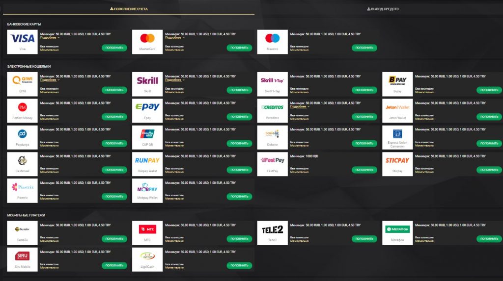 Деньги после пополнения депозита приходят мгновенно. Игровой клуб предлагает более 40 платежных систем для пополнения счета и выведения выигрышных средств. Лимиты на вывод не установлены.