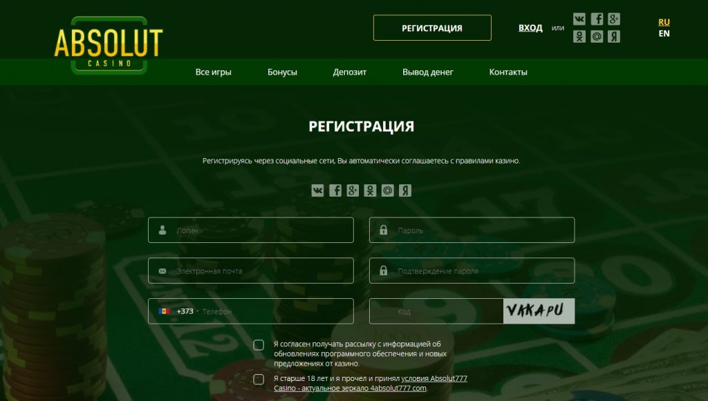 Абсолют дарит большое количество бонусных начислений, но воспользоваться всеми преимуществами азартного портала сможет только зарегистрированный пользователь. Поэтому администрация рекомендует пройти простую процедуру регистрации. Сделать это можно двумя основными способами – заполнить простую анкету либо авторизоваться через действующий аккаунт в одной из социальных сетей.