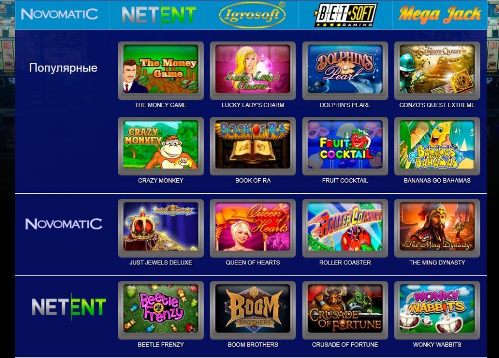 Основные провайдеры программного обеспечения – Igrosoft, Novomatic, Evoplay. Есть также слоты от Casino Technology, Belatra, Unicum, Funkyspins.