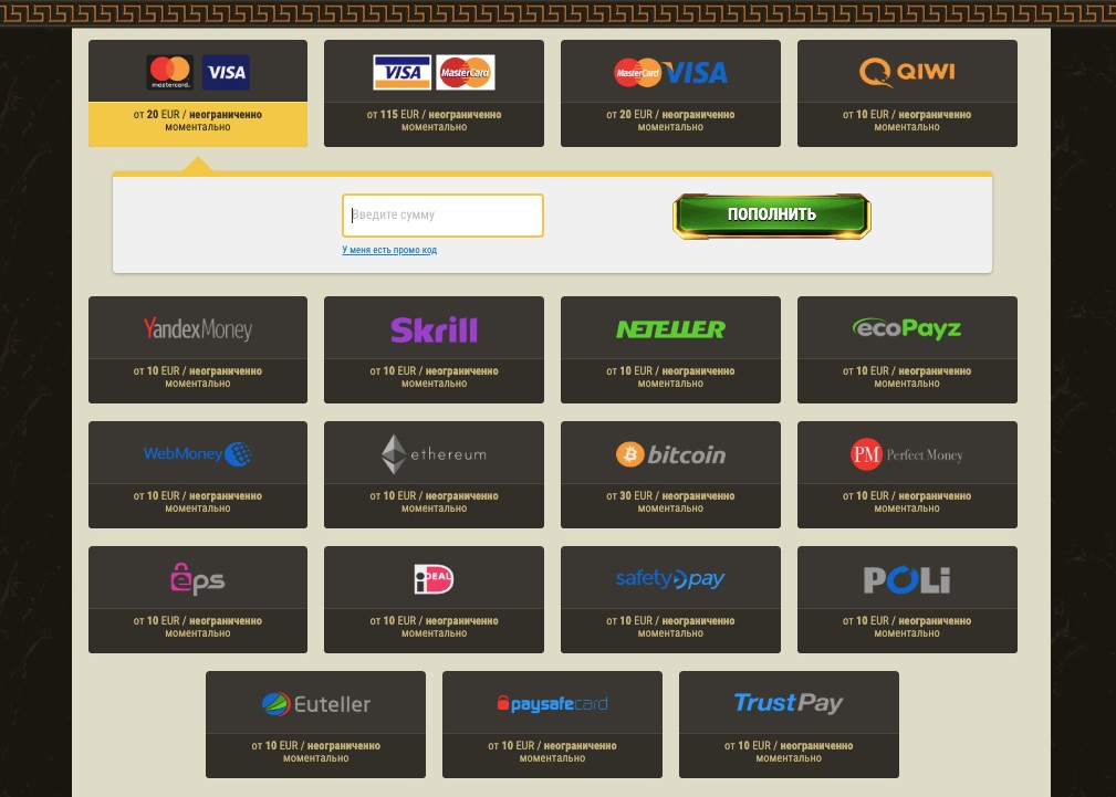 Заявки на вывод денег рассматриваются в течение суток с момента подачи. Также в казино предусмотрены лимиты на вывод: не больше 1500 евро в сутки, 3 тысяч евро в неделю и 9-50 тысяч евро в месяц в зависимости от статуса игрока.