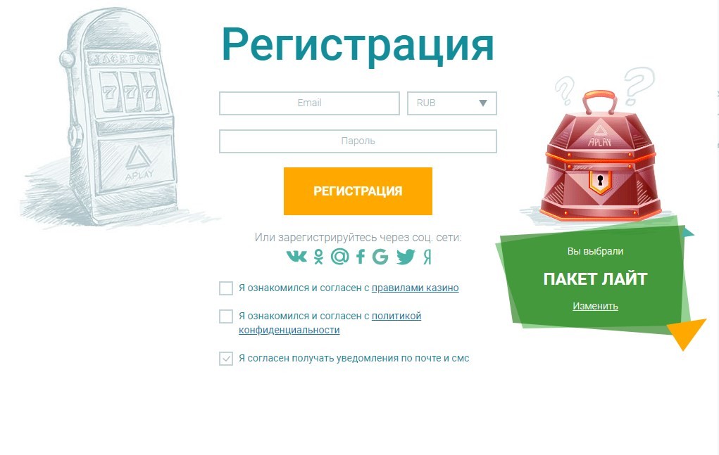 В Aplay Casino кнопки «Входа» и «Регистрации» находятся справа вверху. На деньги могут играть только зарегистрированные пользователи старше 18-летнего возраста. Режим «Демо» доступен для всех посетителей без регистрации.