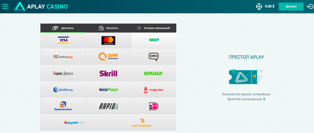 Пополнение счета от 300-500 рублей или эквивалент в другой сумме. Платежные системы: карты МИР, Мастер Кард и Виза (лимит 25 000 рублей на депозит), электронные кошельки Киви, Яндекс.Деньги (лимиты 10-25 тыс. руб. соответственно). С помощью Вебмани возможно зачисление на депозит от 300 рублей, а максимум 30000. Другие варианты: Альфа-Банк, Промсвязьбанк, moneta.ru, paysafecard. Перечисленные способы используют для выведения выигрышей.