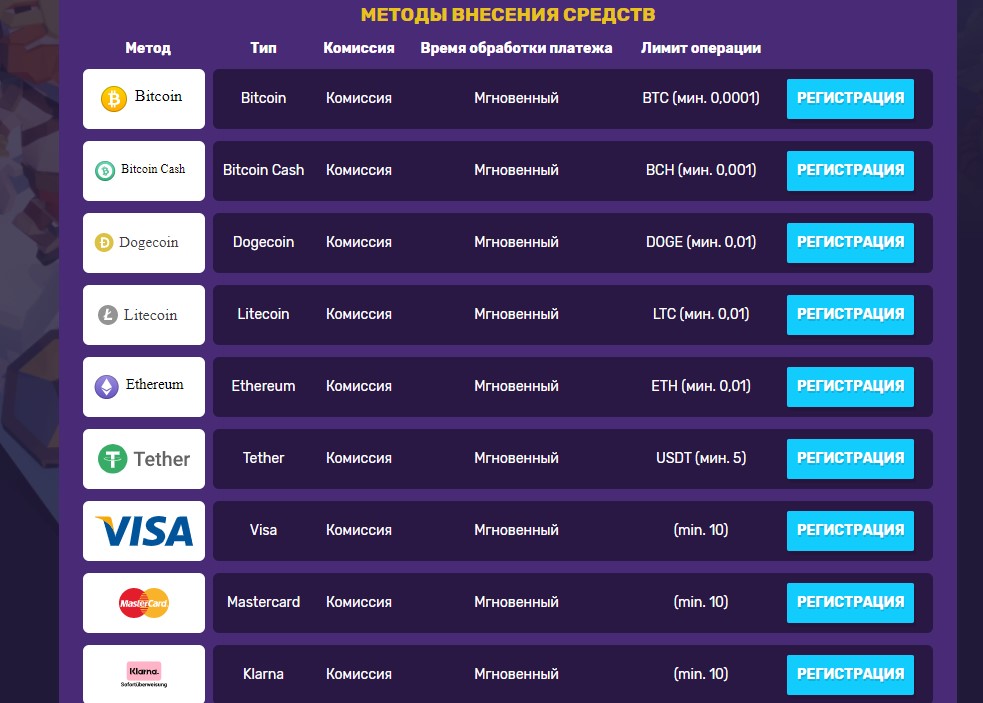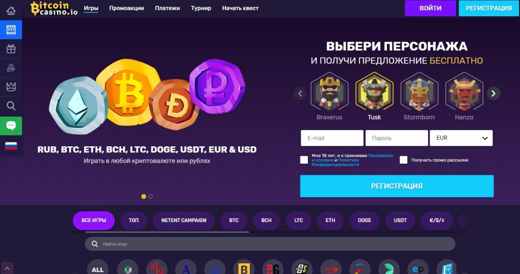 Валюты в казино: AUD, BTC, CAD, CNY, Dogecoin, Ethereum, EUR, JPY, NOK, российские рубли, американские доллары. При депозите и выводе комиссионный сбор Bitcoin Casino.io не взимает с пользователей – на счет поступает полная сумма.