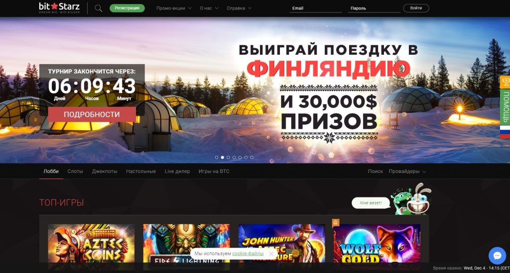 Официальная страница казино Bitstarz встречает посетителей яркими баннерами, расположенными на темном фоне, в них рассказывается о текущих акциях, предстоящих состязаниях и турнирах. Даже несмотря на большой размер рекламы, она не вызывает раздражения, ее нельзя назвать навязчивой. Слева в верхнем углу расположился логотип заведения, а рядом с ним кнопка регистрации в системе.