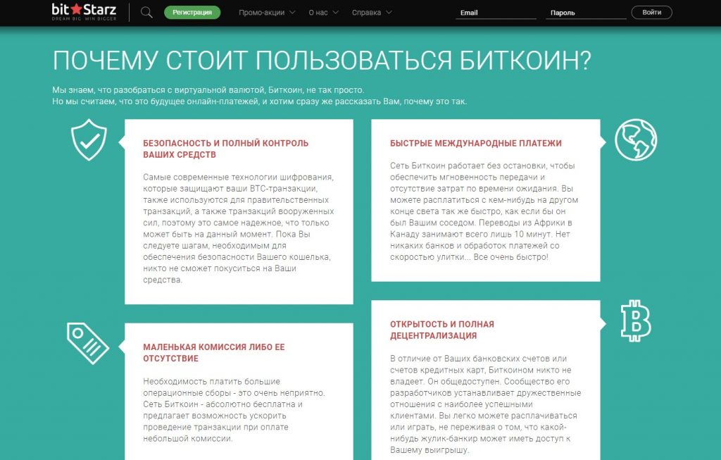 Большим плюсом азартного заведения Bitstarz следует назвать большое количество игровых автоматов, способов ввода денежных средств и кэшаута. Отдельно следует выделить возможность делать ставки в криптовалюте и оставаться при этом анонимным. Среди преимуществ мгновенные выплаты на любые карты и кошельки, круглосуточная работа саппорта, возможность разговаривать с администратором, владеющим несколькими языками.