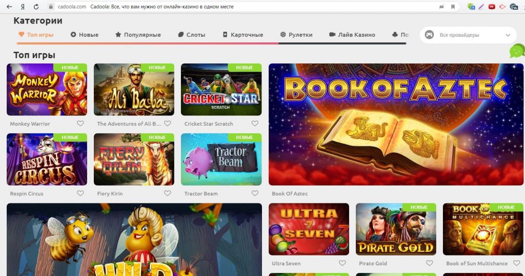 Категории игр на деньги в Cadoola Casino: