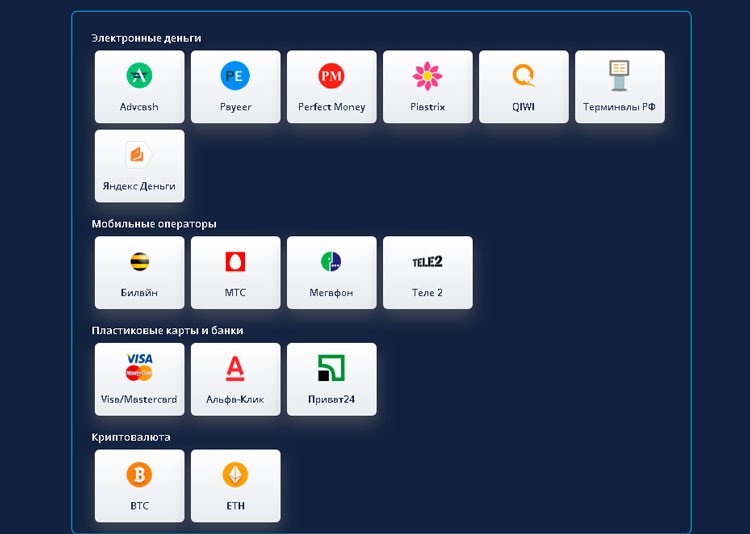 Пополнение BTC имеет минимальный лимит от 1670 руб., а использование Ethereum – от 1300 руб. Вывод осуществляется аналогичными способами. Можно формировать заявку на выплату только на ту систему, посредством которой было заполнение. Зачисление средств только через кошельки/системы/пластиковые карты, которые зарегистрированы на имя игрока.