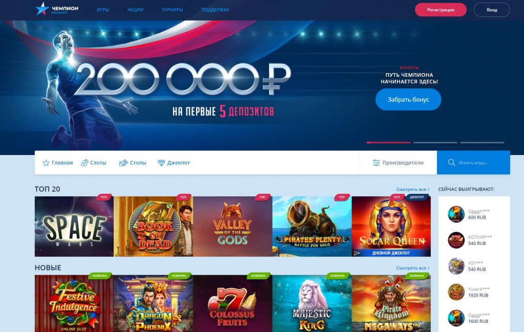 Официальный сайт Champion Casino выдержан в светло-голубом цвете. Рядом с названием игорного заведения находится логотип в виде звезды, оформленной в цветах российского флага. Девиз «Играй и побеждай» возле логотипа дарит уверенность в победе и подталкивает сделать депозит. На основной страничке посетителям портала бросается в глаза большой рекламный баннер с действующими акциями и бонусами. Чуть ниже находятся удобные кнопки навигации по разделам: зеркала, бонусы и главная.