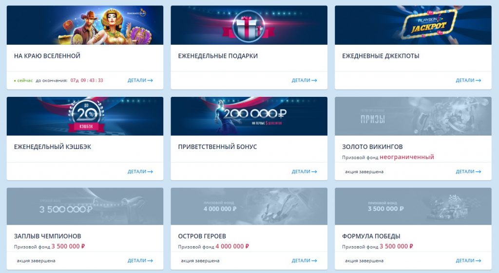 Несмотря на молодой возраст, игорный клуб заслуживает положительной оценки пользователей и постепенно завоевывает популярность. Самое главное преимущество в том, что все недавно зарегистрированные клиенты получают до 200 тысяч рублей за первые пять пополнений депозитов. На данный момент накопительный джекпот лицензионного казино составляет 49 853 389 рублей.
