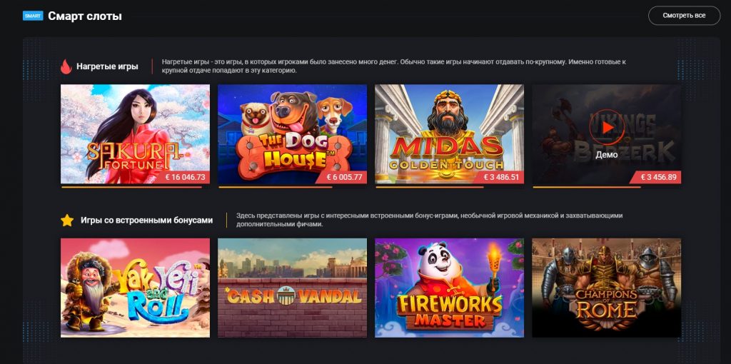 Есть еще одна интересная особенность. В Drift Casino есть раздел «Смарт-слоты». Их еще называют «нагретыми». В эту рубрику добавляются однорукие бандиты, в которые уже было занесено много денег, а, соответственно, именно в таких приложениях можно сорвать куш.