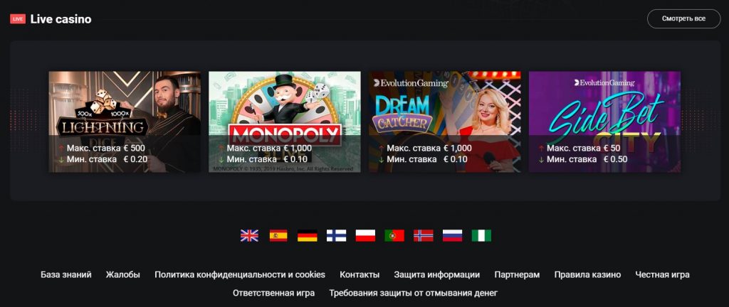 Здесь есть монополия, крэпс, несколько разновидностей покера, около 10 разновидностей рулетки, блэк джек, баккара, моментальные лотереи, сик-бо и даже виртуальный футбол. Отметим, что в Live Casino нет демо-режима, то есть опробовать игры бесплатно не выйдет. Также в данных играх нет возможности побороться за накопительный джек-пот от казино.
