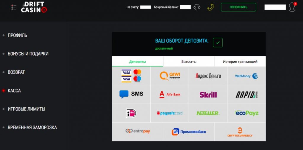 Несмотря на то, что Drift является европейским онлайн-казино, здесь поддерживается несколько языков интерфейса, в том числе русский. Также есть русскоязычный саппорт и есть возможность проводить финансовые операции в рублях. Поговорим подробнее о преимуществах и особенностях казино и выясним, как здесь нужно ставить чтобы получить максимальный профит.