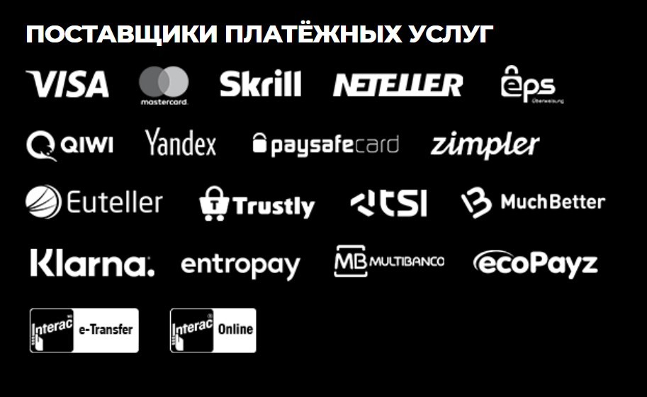 Пополнение счета доступно с помощью платежных систем: Abaqoos, DotPay, EntroPay, Euteller, Giropay, iDeal, MasterCard, moneta.ru, Multibanco, Neteller, Paymenticon, Paysafecard, Przelewy24, QIWI, Skrill, Skrill 1-Tap, SOFORT, SporoPay, Trustly, TrustPay, Visa, WebMoney, Zimpler, Банковский перевод, Яндекс.Деньги.