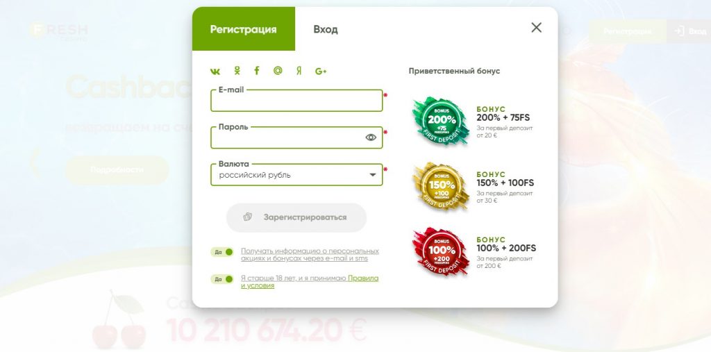 У Фреш казино всегда в наличии несколько действующих зеркал, благодаря которым можно не беспокоиться о блокировке провайдером. Игровые аппараты отличает высокий процент отдачи, все они лицензионные. Бонусная политика щедрая, при этом небольшие вейджеры. Есть Лайв казино – для любителей оффлайн атмосферы азартных клубов.