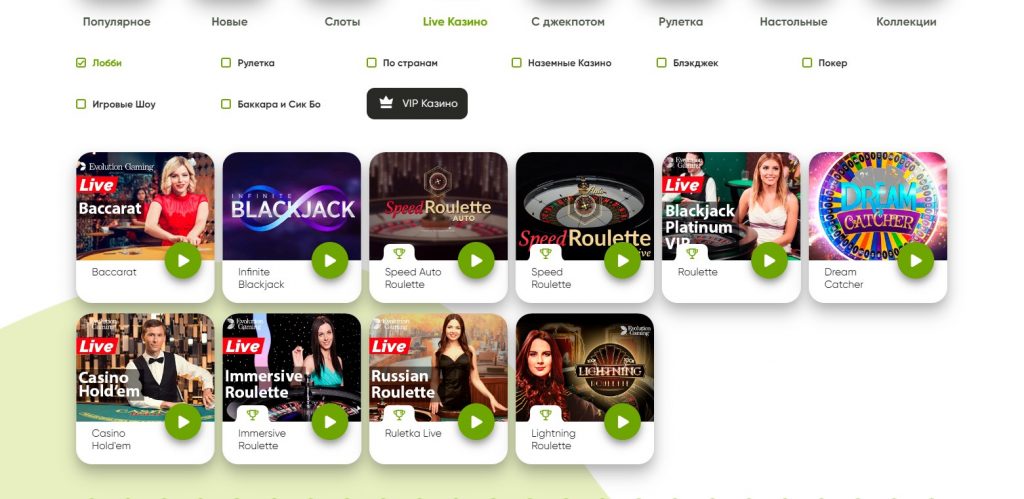 Если хочется окунуться в атмосферу наземного казино, рекомендуется посетить Лайв игры – в них руководят процессом профессиональные живые дилеры. Трансляция ведется из настоящих казино, поэтому игрок воочию может наблюдать за ходом игры.