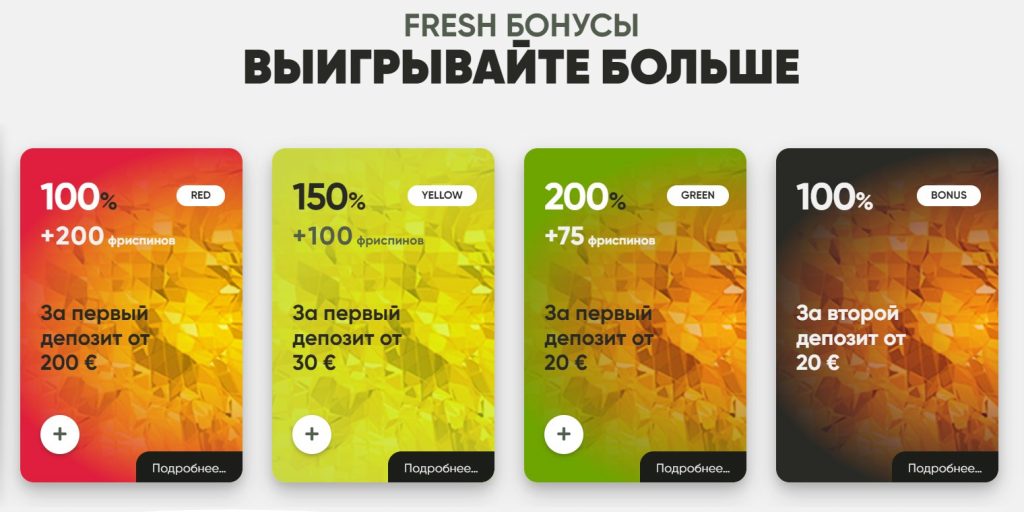 Игра на реальные деньги приносит пользователям FreshCoins. За каждые 3000 рублей ставок в играх начисляют 1 балл. Чем больше баллов, тем выше статус в системе. Всего их 9: Light, Mid, Classic, Grand, Cool, Intense, Strong, Elite, Fresh.