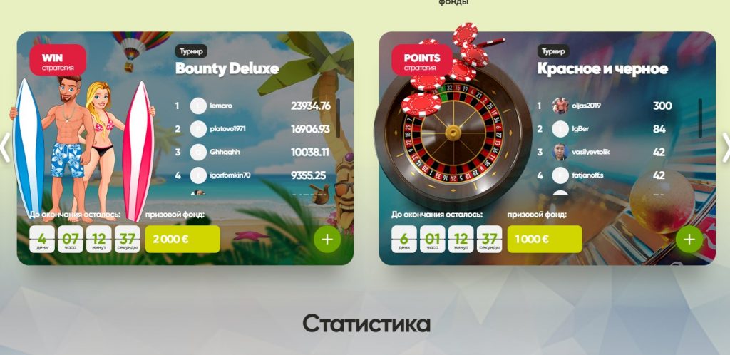 Чтобы азартная жизнь стала еще ярче, игровой портал предлагает турниры с внушительными денежными призами. Участником становится любой игрок, который крутит слоты на деньги, включенные в соревнования. Побеждает тот, у кого сумма выигрышей за весь турнир больше (в сравнении с другими пользователями).