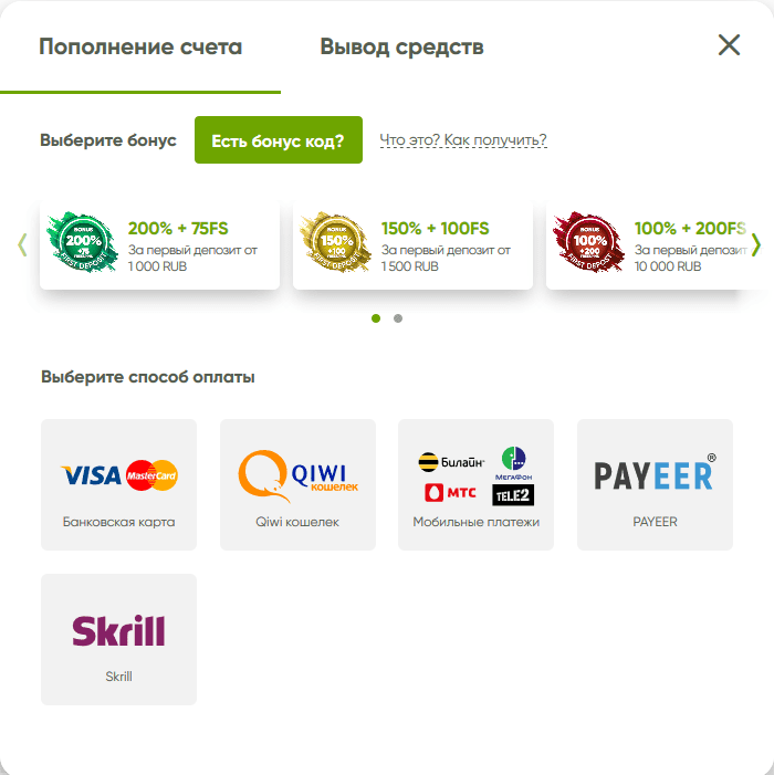 - За второй депозит от 1000 рублей можно получить 100% или выбрать 100 фриспинов.