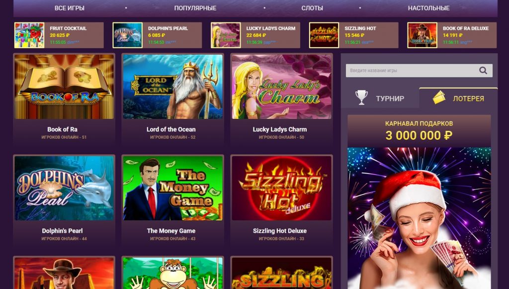 Самые востребованные игры в клубе на рубли: Book of Ra, Lord of the Ocean, Lucky Lady’s Charm, Dolphin’s Pearl, The Money Game, Sizzling Hot Deluxe.