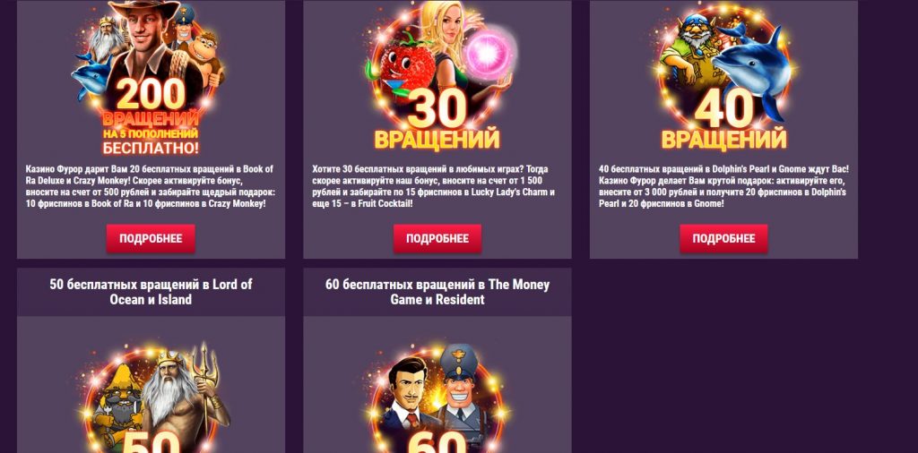 Furor Casino периодически проводит тематические акции, которые приурочены к определенному дню – празднику. Обычно дарит деньги на депозит – 20-50%. Из постоянных бонусов – это бесплатные вращения в популярных слотах.