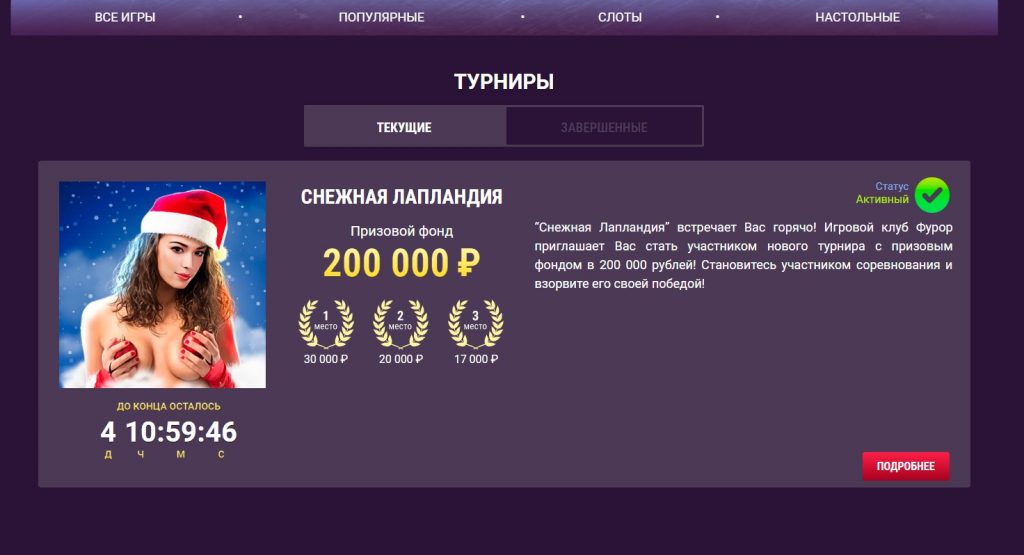 В казино Фурор проводятся турниры, их описание находится во вкладке с одноименным названием. У каждого турнирного соревнования необычное индивидуальное название, а еще условия участия. Как правило, чтобы стать участником, ничего не надо делать – достаточно крутить барабан на реальные деньги в слотах, которые включены в состязания.
