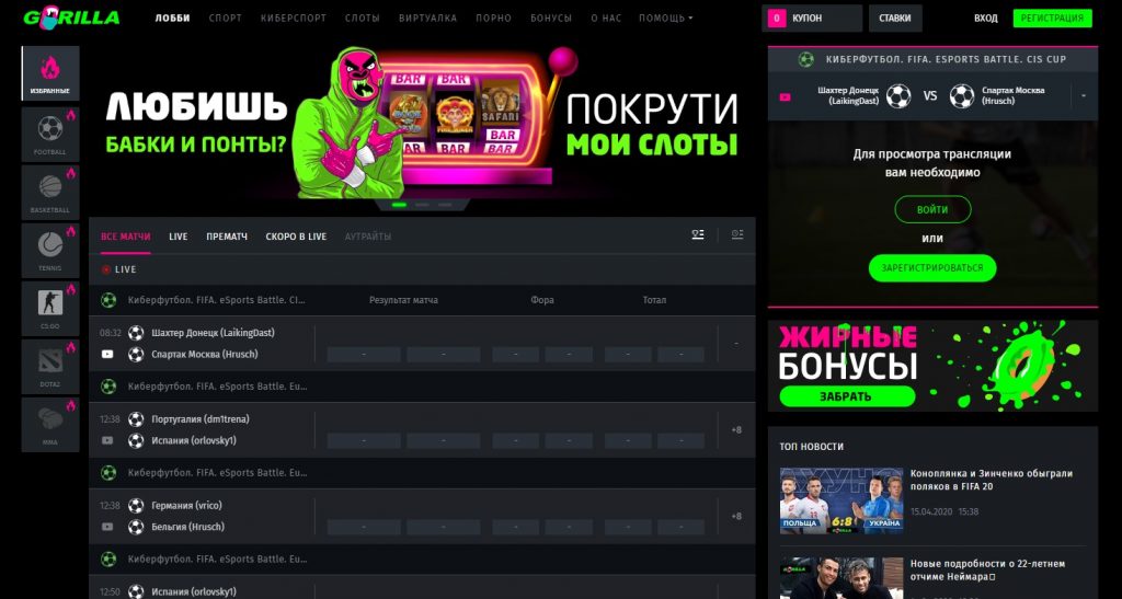 Официальный сайт клуба Горилла напоминает букмекерскую контору, а не казино. Просто игры выделены в отдельный раздел. Логотип заведения в виде названия азартного портала находится вверху слева на главной странице. Рядом вкладки, обеспечивающие быстрый переход в разделы: Игры, Спорт и Киберспорт, Виртуалка, Бонусы, Помощь.