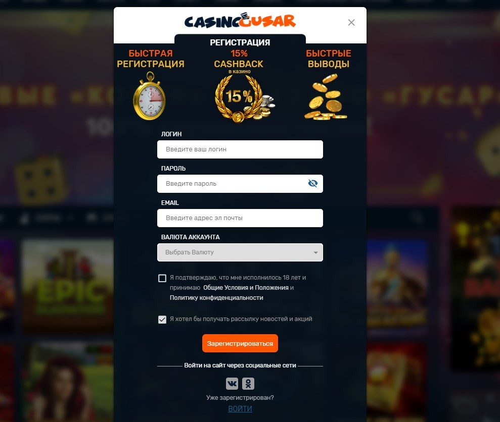 Найти кнопки входа и регистрации на официальной странице несложно. Они находятся справа сверху. Чтобы играть на деньги в Gusar Casino, нужно создать учетную запись. Процесс регистрации в онлайн клубе не займет много времени.