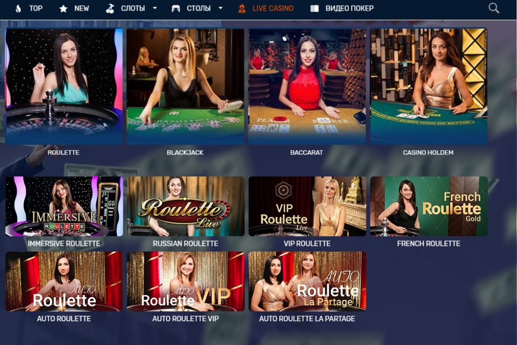 - Игры с живыми крупье помещены во вкладку «Live Casino». Здесь можно играть только на деньги, поэтому разрешен вход исключительно зарегистрированным пользователям.