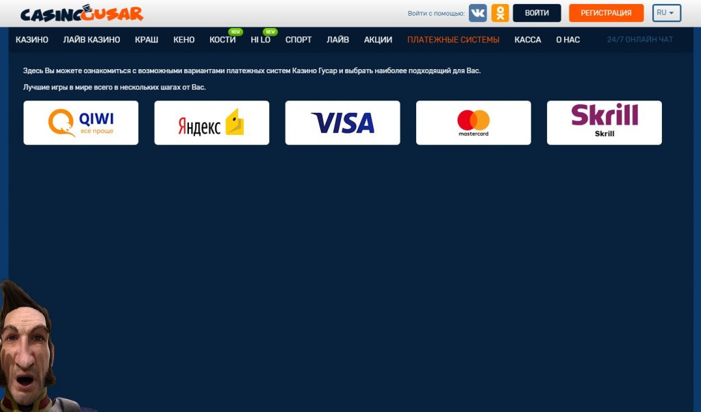 Игорное заведение Гусар поддерживает работу с небольшим количеством платежных систем. При выводе и выводе денег игроки используют пластиковые карты Виза, Мастеркард или электронные кошельки Киви, Яндекс, Skrill. На сайте содержится информация, что все транзакции по пополнению счета проходят мгновенно и без комиссий со стороны игорного заведения. Также клуб быстро выплачивает деньги, поставленные на вывод.