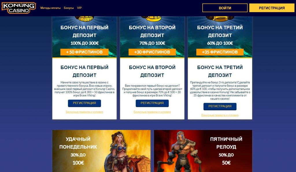 Каждый понедельник игроки могут активировать бонус перезагрузки – пополнение депозита принесет плюсом 30%, однако до 100 евро, + 30 бесплатных вращений. На счет зачисляют от 700 рублей. По пятницам в клубе Конунг действует релоад бонус – 50%, но до 50 евро.