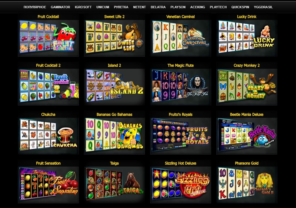 Ассортимент развлечений включает в себя настольные вариации – блекджек, баккару, кено, рулетку разных видов. Игровые автоматы от проверенных временем провайдеров Игрософт и Новоматик, в том числе и классические вариации – Crazy Monkey, Sizzling Hot, Fruit Cocktail. Есть современные 3D модели с необычным оформлением, оригинальным геймплеем и многоуровневыми бонусными раундами.