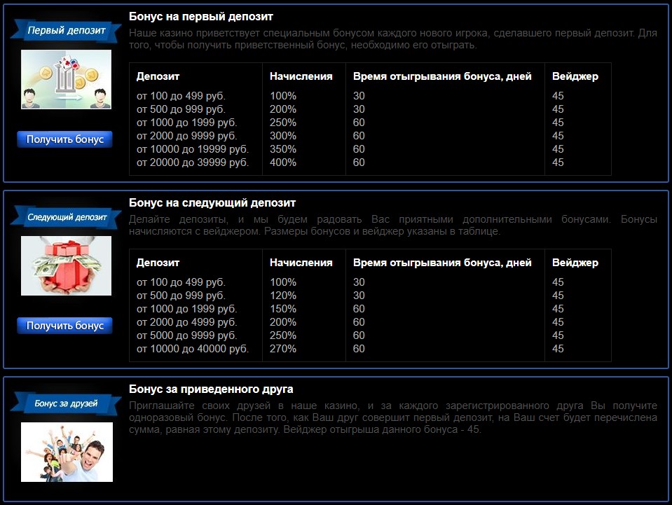 За активность подарки выдают индивидуально. Чем больше клиент играет на деньги в автоматы, тем лучшие предложения поступают от менеджеров. О бонусе сообщают только по телефону, поэтому его указывают и подтверждают в профиле.