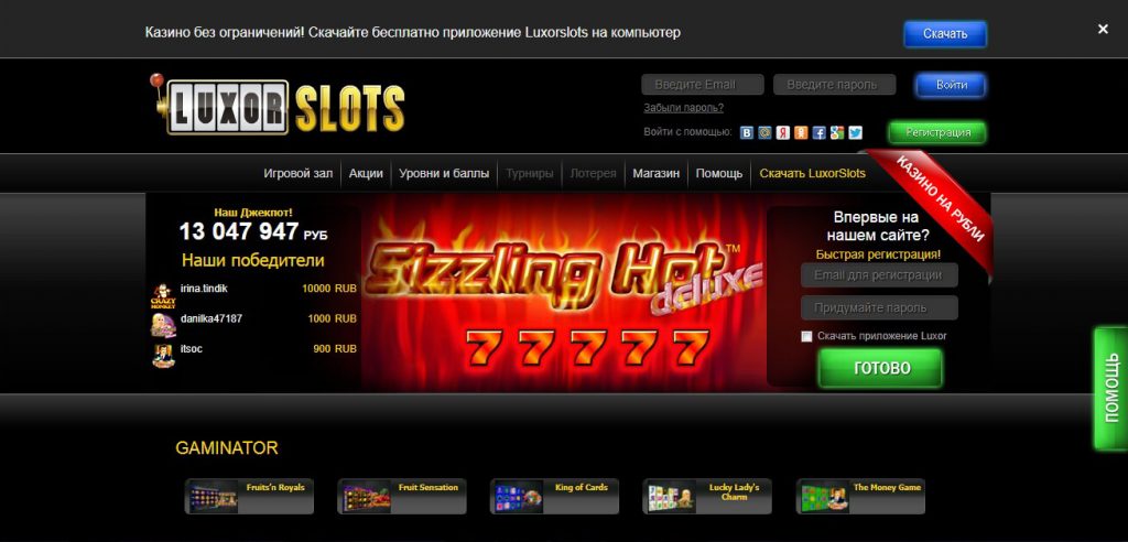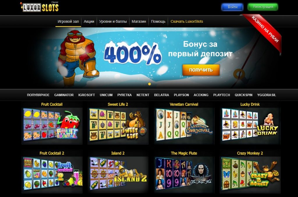 Официальный сайт казино Люксор Слотс предлагает свыше 1000 игр. Можно играть онлайн на персональном компьютере, с телефона или планшета. Программное обеспечение от Igrosoft, Novomatic, Belatra, Yggdrasil, Quickspin, Playtech, Unicum и др. провайдеров.