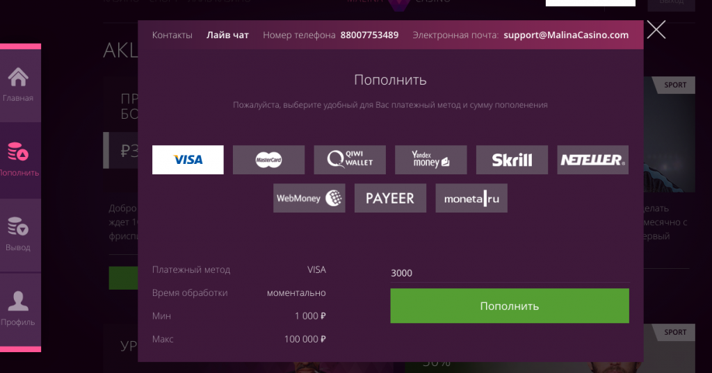 Казино Малина предоставляет круглосуточную поддержку для своих пользователей. Если появились вопросы, которые касаются пополнения депозита, вывода выигрыша и пр. моментов, можно связаться с оператором в Лайв Чате – вкладка находится справа портала. Есть возможность написать на почту [email protected] или позвонить по телефону +7 (800) 775-34-89.