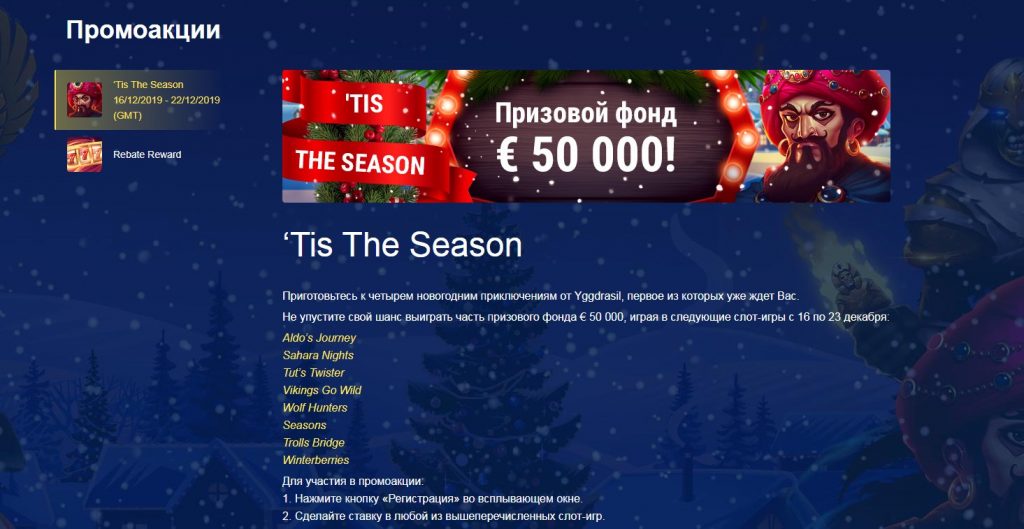 На портале регулярно проходят различные акции, розыгрыши и турниры. В преддверии новогодних праздников посетители клуба могут выиграть много денег, получив часть призового фонда в размере 50 000 евро. Участвовать может каждый зарегистрированный пользователь. Любой спин в перечисленных играх дает шанс на получение приза в размере 10-8000 евро.