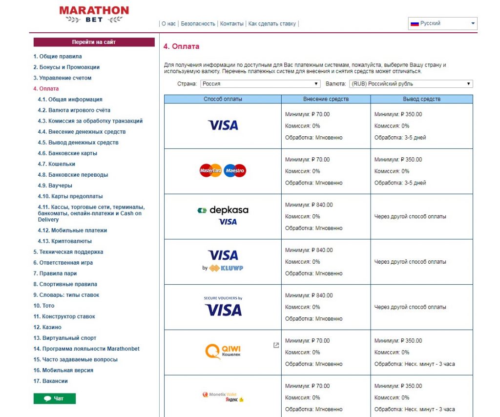 В азартном клубе Марафон Бет доступны следующие варианты пополнения счета и вывода денег: пластиковые карты Виза, Маэстро и Мастеркард, электронный кошелек Киви, Яндекс. деньги, мобильные платежи Мегафон, Билайн, МТС, платежные системы Теле2, Биткоин и другие.