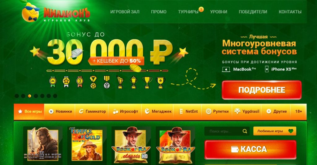 В казино Миллионъ множество игровых автоматов. На портале разыгрывается крупный накопительный джекпот. Деньги выводят быстро, комиссия отсутствует. К преимуществам относят высокий уровень технической поддержки, широкий диапазон ставок, выгодные турнирные состязания.
