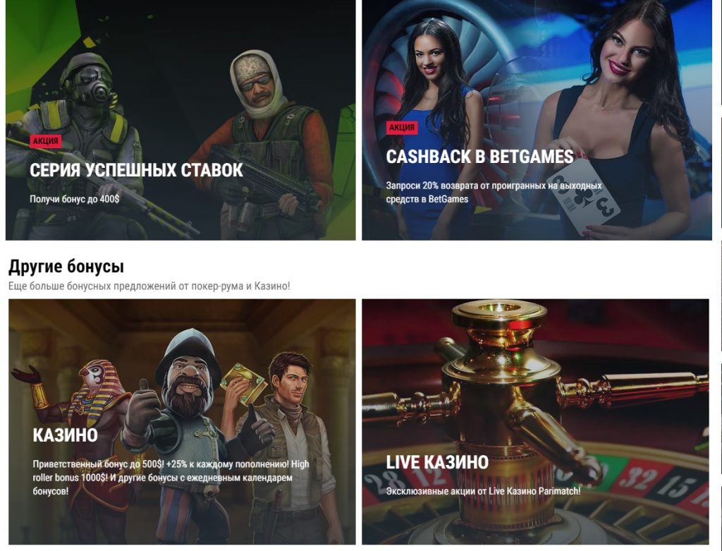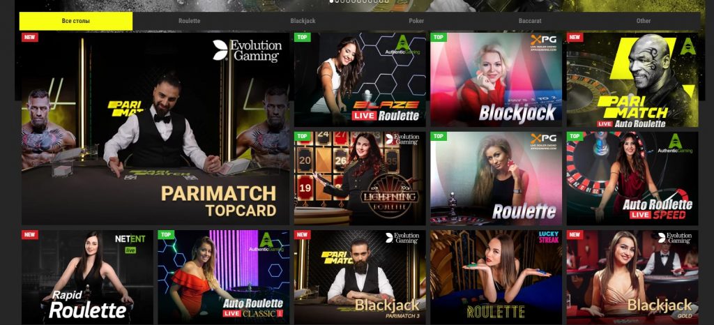 Нельзя не отметить уникальное разнообразие, современный дизайн залов для карточных игр. Примечательно, что делать ставки можно в Live-режиме, всего представлено 28 видов рулеток, 13 столов для игры в блэк-джек, 8 столов баккары. В прямом эфире клиенты ПариМатч играют также и в монополию.