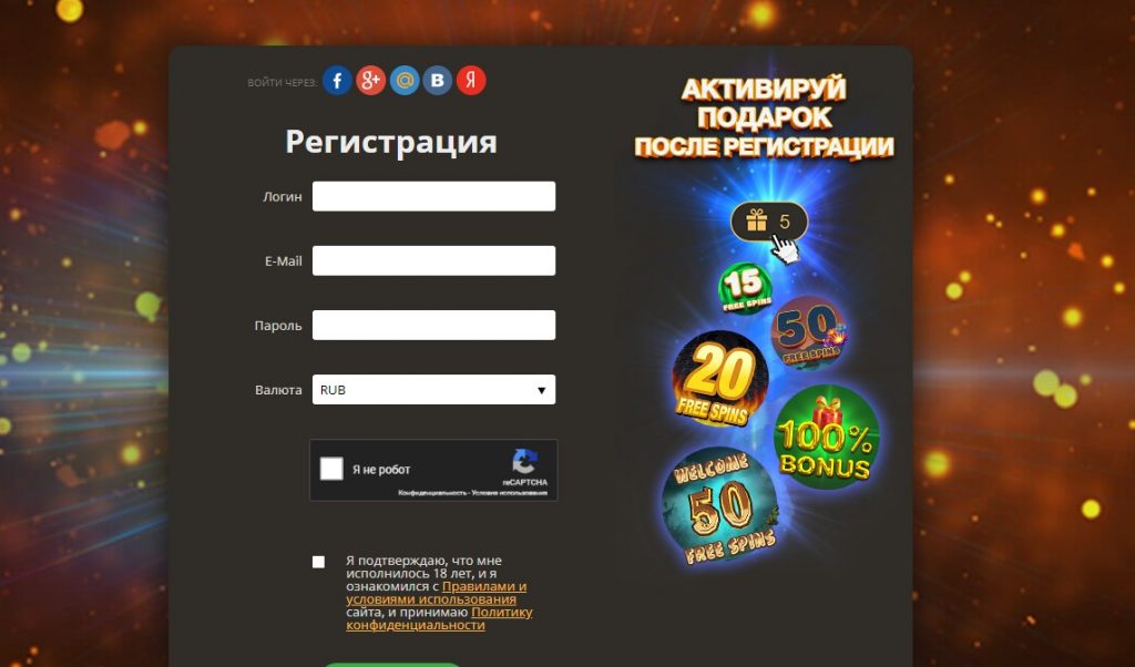 - В один клик через аккаунт в социальной сети. Для привязки необходимо кликнуть на кнопку Зарегистрироваться, затем войти через одну из предложенных социальных сетей. Казино поддерживает: Вконтакте, Фейсбук, Одноклассники, Яндекс и Твиттер.