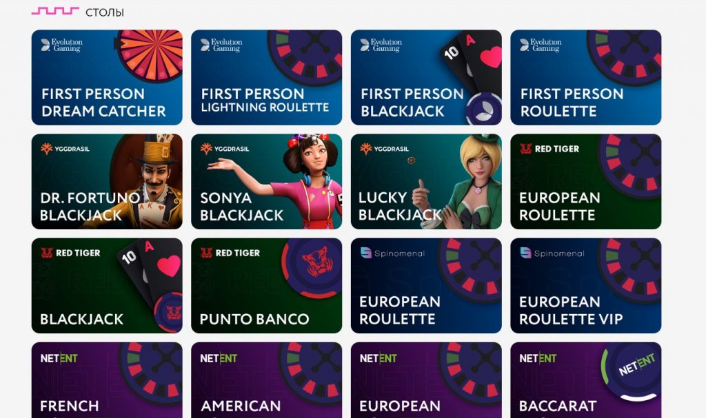 - Столы – много разновидностей рулетки, покера, блэкджека и баккары.