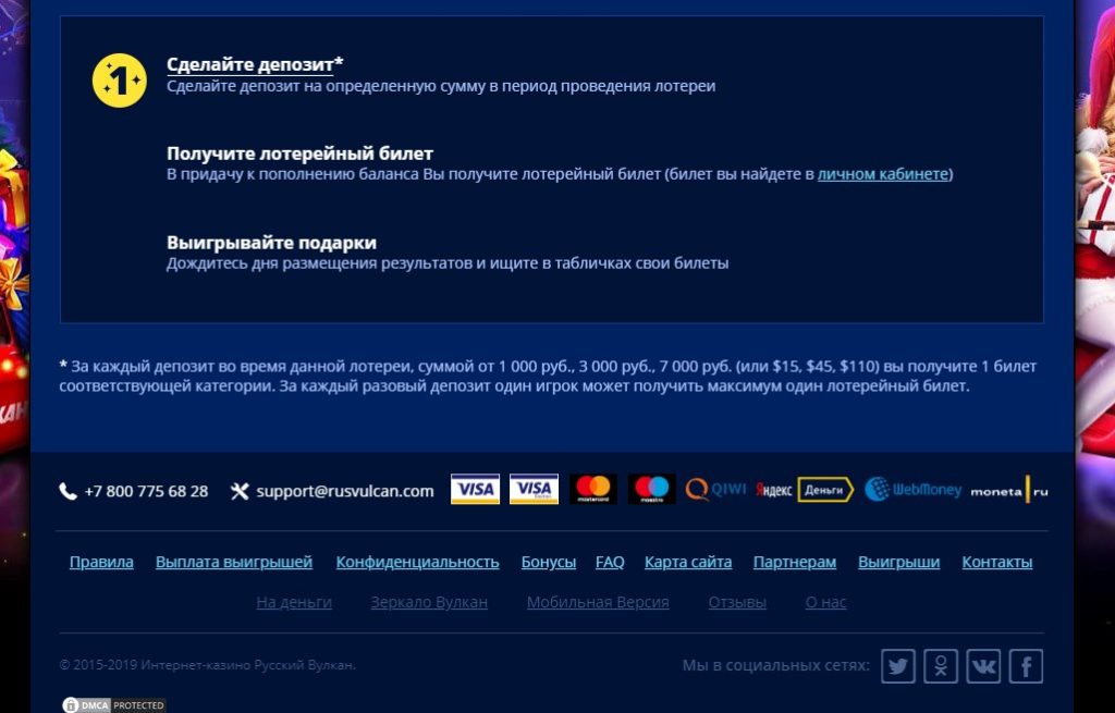 Наш вердикт: Русский Вулкан – отличное онлайн-казино, которое подойдет даже новичкам с низким банк-роллом, так как минимальный депозит составляет всего лишь 50 рублей. На портале есть программа лояльности, поэтому игроки могут рассчитывать на щедрые бездепы, крупный кэшбек, интересные лотереи и турниры.