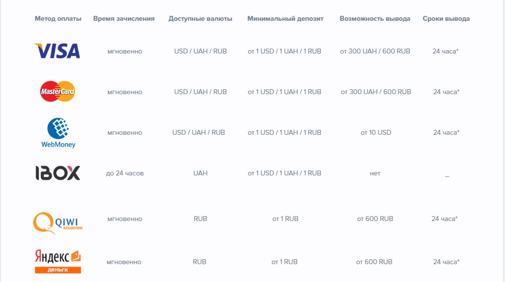 Валюта сайта – российские рубли, гривны и доллары. Минимальное пополнение счета 1 рубль, а вывода – 600 рублей или эквивалент в другой валюте. Верификация при выводе – только по запросу службы безопасности.