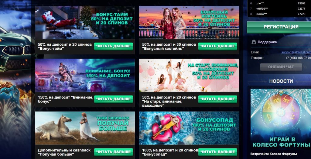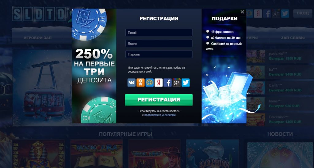 Еще во время заполнения регистрационной формы казино Слотозал предлагает бонус за регистрацию – фриспины в популярных аппаратах, тройной множитель на первые 30 минут игры (он позволяет заработать максимальное количество баллов) либо возврат денег за первый день.