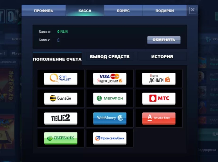 Способы пополнения счета и вывода выигрышей: национальная платежная система МИР, карточки Виза и Мастер Кард, Маэстро, Альфа Банк, Яндекс.Деньги, Вебмани, Сбербанк Онлайн и Альфа Банк. Пополнить депозит можно через сотовых операторов РФ, однако они за свои услуги взимают комиссию, размер зависит от переводимой суммы.