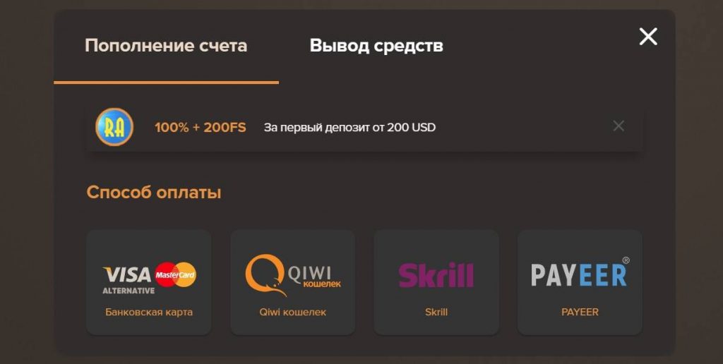 Казино предлагает удобные варианты вывода денежных средств и пополнения счета. Глядя на список инструментов, можно сразу увидеть ориентацию на жителей СНГ, потому что методы такие: карточки Виза, Мастер Кард, Яндекс. Деньги, Киви, сотовые операторы РФ и др.