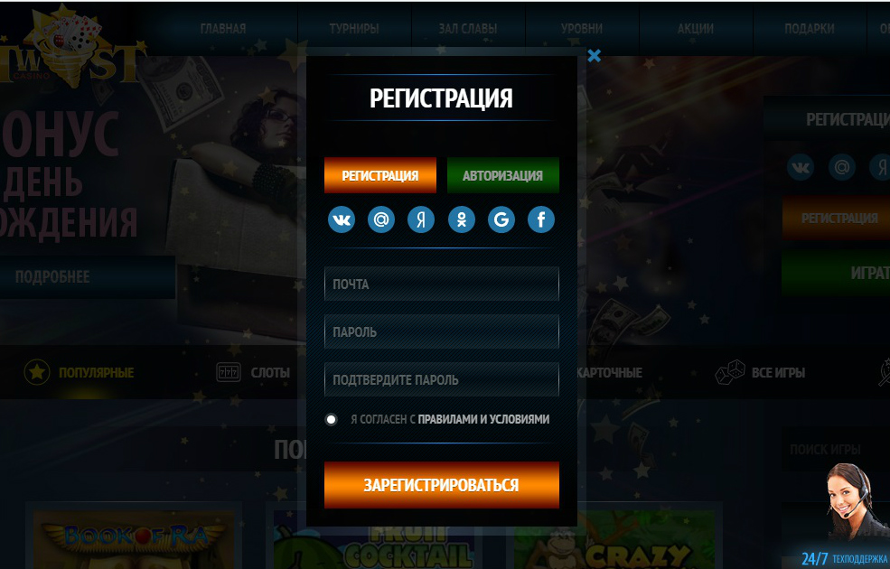 Вход в Twist Casino через социальные сети занимает пару секунд времени, игрок автоматически соглашается с правилами и условиями игры на деньги.