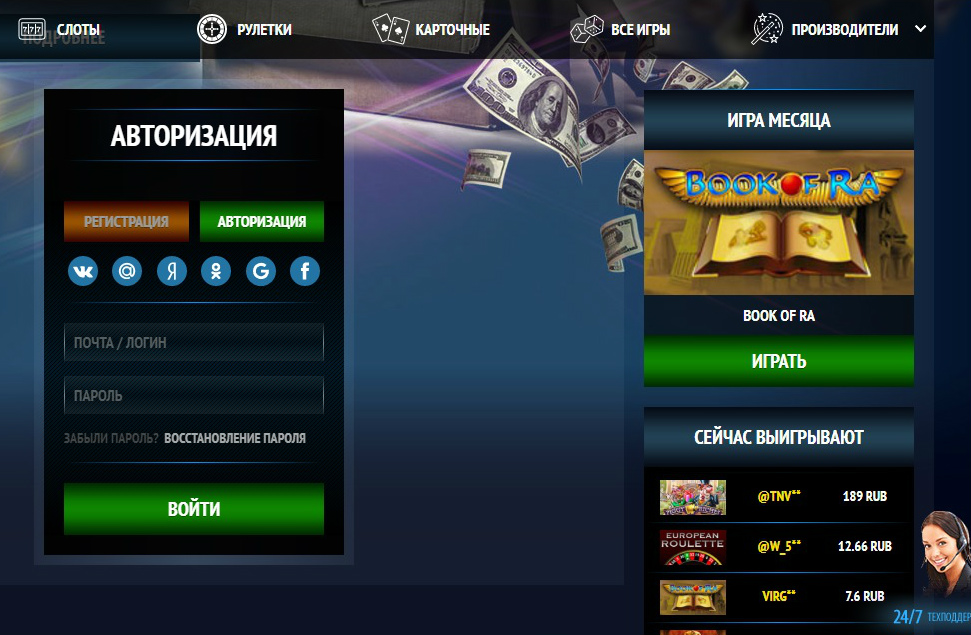 Дизайн онлайн-казино достаточно простой. Логотип заведения в виде названия клуба и игральных карт находится в левом углу вверху. Рядом расположены блоки «Вход» для авторизации гемблеров и «Регистрация» для новичков. Можно войти через социальные сети: Одноклассники, Твиттер, Фейсбук, Яндекс, Mail.ru и др.