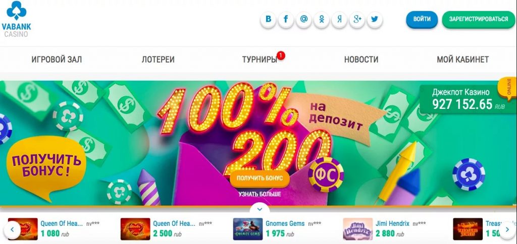 В верхней части страницы панель с кнопками входа, регистрации, иконками социальных сетей. После подтверждения аккаунта, на панели игрок увидит остаток денег на личном счете, количество бонусов. Платформа направлена на русскоязычных игроков, информация казино Va Bank доступна на русском.
