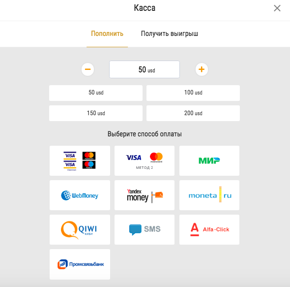 Для пополнения счета и кэшаута нужно выбрать платежную систему. Удобнее выбирать единый вариант для ввода и вывода.